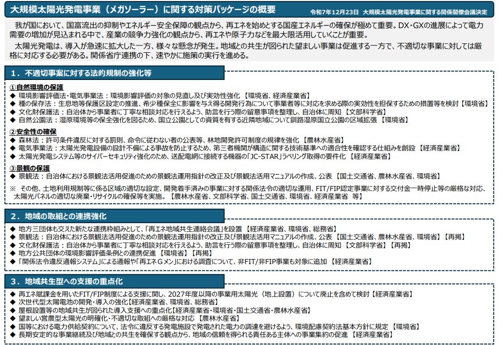 政府は2025年12月23日、大規模太陽光発電事業に関する関係閣僚会議を開催し、メガソーラーを巡る課題への対応をまとめた対策パッケージを決定した。太陽光発電の急速な導入拡大に伴い、自然環境への影響や安全性、景観悪化への懸念が各地で顕在化する中、関係法令の運用強化と制度見直しを通じ、地域との共生を重視した事業環境の再構築を図る。自然環境保護では、環境影響評価法や電気事業法の対象見直しと実効性強化を進めるほか、希少種保全や文化財保護、自然公園の区域拡張などを盛り込み、開発段階からの規律強化を打ち出した。