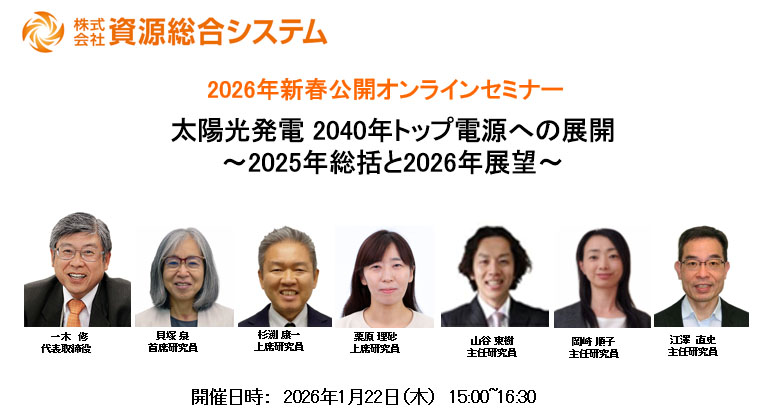 資源総合システムは2026年1月22日、太陽光発電市場の最新動向と将来展望をテーマとした公開オンラインセミナーを開催した。会員企業向けに毎月実施しているオンラインセミナーのうち、新春に限り一般参加も可能とする年1回の特別企画として位置付けられる。国内外の太陽光発電産業や市場動向を継続的に分析してきた同社が、2025年の総括と2026年以降の方向性を整理した。