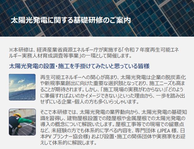 【太陽光発電】JPEA:非住宅屋根向け太陽光の基礎研修を緊急募集