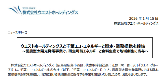 ウエストホールディングスは、千葉エコ・エネルギーと営農型太陽光発電事業に関する資本・業務提携を締結した。再生可能エネルギーの導入拡大と食料生産の両立を図り、地域創生につなげることを目的とする。脱炭素社会の実現と食料安全保障という二つの課題を同時に捉えた取り組みとして位置づけられる。