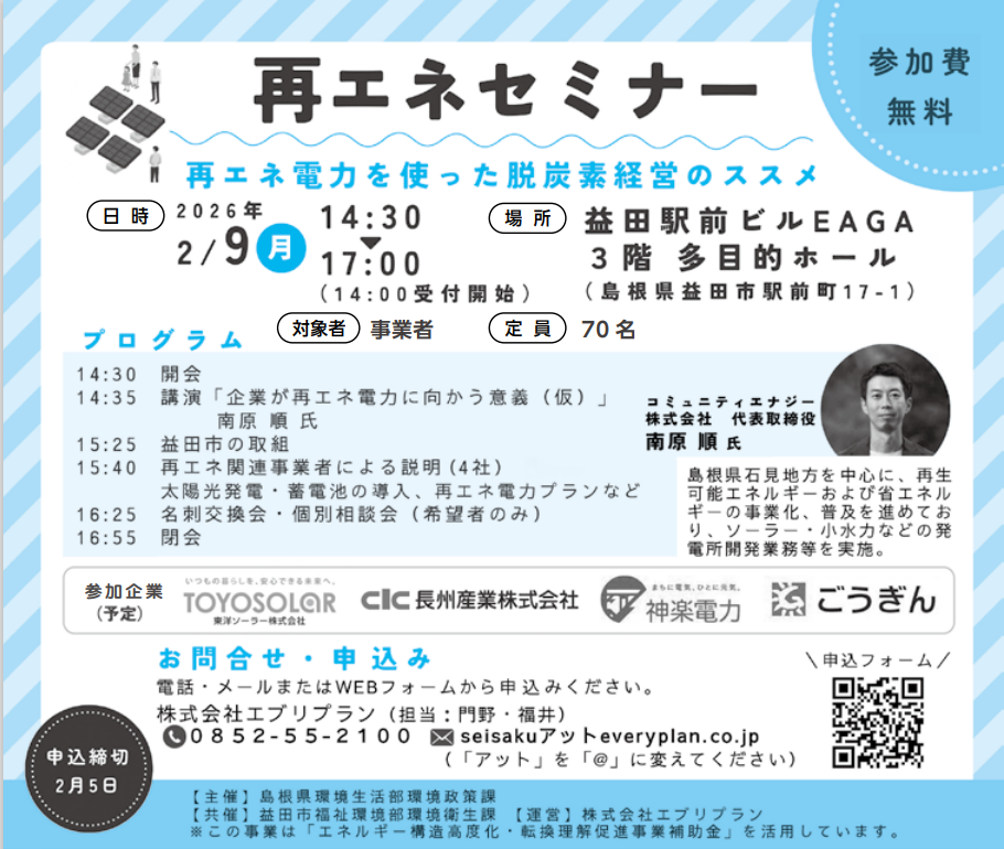 益田市は、島根県と共同で、企業向け再エネセミナー「再エネ電力を使った脱炭素経営のススメ」を開催する。企業が脱炭素経営に取り組む意義や、再生可能エネルギー導入の具体的手法を学ぶ機会を提供し、地域企業のGX対応を後押しする。