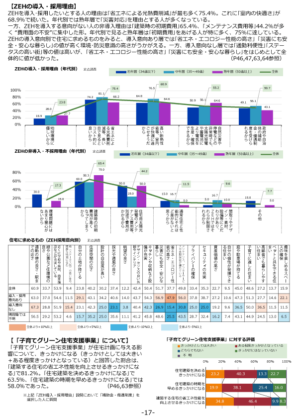 非導入理由では「初期費用の高さ」や「メンテナンス費用」が上位を占め、コストへの不安が導入の壁となっている。ただしこれは単なる価格の問題ではなく、将来のエネルギー価格や制度継続性への不透明感が心理的なハードルを高めているとも言える。ZEH市場は、普及段階から「納得の段階」へと移行しつつある。