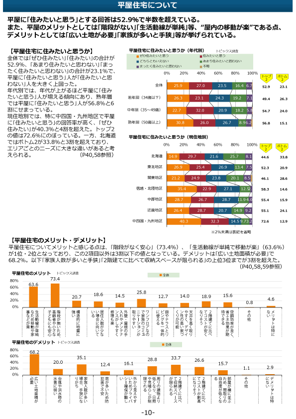 平屋住宅については、「住みたい」とする回答が52.9%と半数を超えた。階段がない安心感や生活動線の単純さといった評価が突出しており、デザインや流行よりも、日常の負担を軽減する合理性が支持されている。