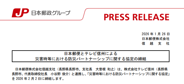 日本郵便信越支社は、テレビ信州と「災害時等における防災パートナーシップに関する協定」を2026年2月2日に締結する。災害発生時における迅速かつ正確な情報共有を目的とし、郵便局の営業状況や郵便物の取扱状況など、生活に直結する情報の発信体制を強化する。
