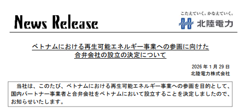 本件は、北陸電力が海外で主導する初の事業案件となる。今後の海外展開に向けた足がかりと位置づけ、事業領域の拡大を進める方針だ。合弁会社の設立は、ベトナム当局による許認可取得などを前提としており、必要な手続き完了後に正式に実施される予定となっている。