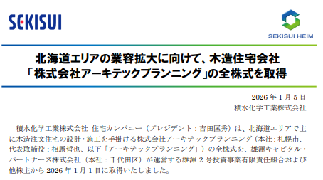 積水化学工業は、北海道エリアにおける住宅事業の業容拡大に向け、木造注文住宅を手掛けるアーキテックプランニングの全株式を取得した。取得日は2026年1月1日。鉄骨ユニット住宅を中心に展開してきた同社は、木造住宅分野を取り込み、地域特性に応じた事業基盤の強化を進める。