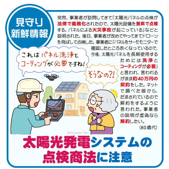 【太陽光発電】国民生活センター:太陽光点検商法に注意喚起、高齢者被害の相談増加