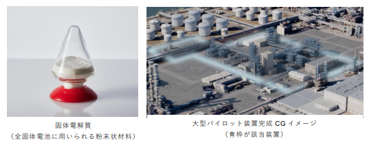 今回建設を決めた大型パイロット装置は、これまでの実証成果を踏まえた次段階にあたり、年間数百トン規模の生産能力を見込む。建設地は千葉事業所(千葉県市原市)で、2027年中の完工を目指す。建設工事は千代田化工建設が担当する。固体電解質の量産技術開発は、新エネルギー・産業技術総合開発機構のグリーンイノベーション基金事業にも採択され、補助を受けながら進行している。