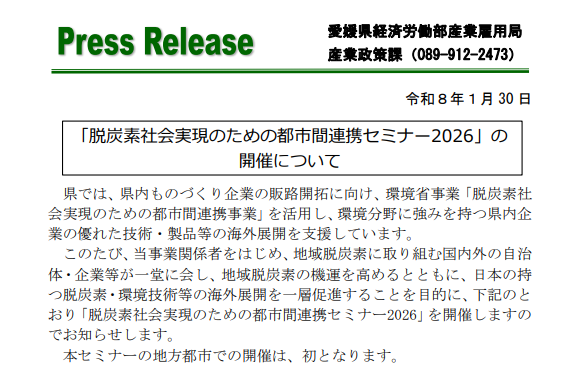 愛媛県は、脱炭素社会の実現に向けた国際的な都市間連携をテーマとする「脱炭素社会実現のための都市間連携セミナー2026」を、2026年2月5日に松山市で開催する。環境省の都市間連携事業を活用し、県内ものづくり企業の環境技術や製品の海外展開を後押しする取り組みの一環となる。地方都市での開催は今回が初となり、地域脱炭素の機運醸成と日本の脱炭素・環境技術の国際展開促進を目的とする。