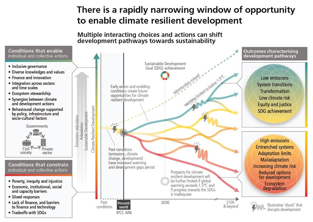 IPCCは「将来は現在の選択と行動で決まる」と強調する。理想的には1.5℃で温暖化を止める道筋があるが、現実はそのペースに乗れていない。途中で改善しても、最善の未来には戻れない。今の世代の責任は極めて重い。