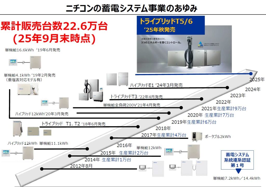 家庭用蓄電システムは2012年と業界に先駆けて市場投入した。系統連系のJET認証第1号を取得するなど実績を積み上げてきた。累計生産は2014年に1万台、2019年に6万台、2023年に15万台を突破し、2025年には22万台超に達した。