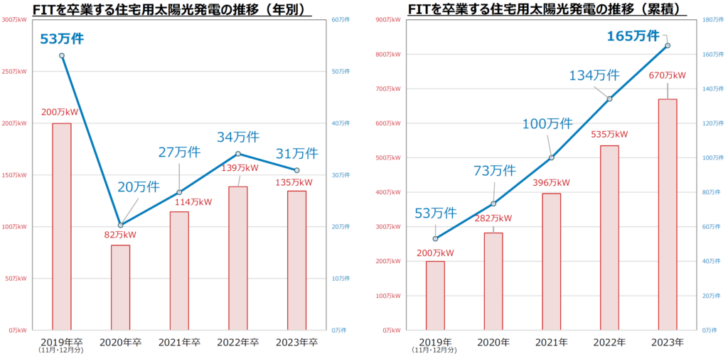 市場拡大の起点となったのが、住宅用太陽光発電の固定価格買取制度(FIT)の買取期間満了、いわゆる「2019年問題」だった。2009年以前に設置された住宅用太陽光は、10年間の固定買取期間を終え、同年11月以降、順次「卒FIT」を迎えた。初年度だけで約53万件、23年まで累計で約165万件・670万kW規模に上り、現在も順次卒業が続く。