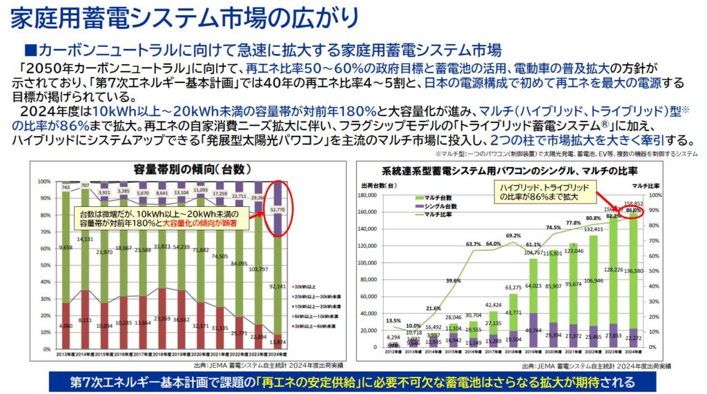 国内の家庭用蓄電システム市場は、2024年度の出荷台数が約15.9万台(前年比102%)。累計出荷は約98万台と100万台規模に迫る。容量面では10kWh超が主流となっている。太陽光・蓄電池・EV等を一体制御するマルチ型(ハイブリッド・トライブリッド)が全体の8割超を占め、この中でニチコンは2割超のシェアを持つ。