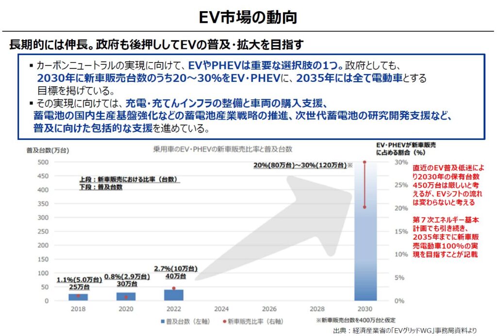 「電気自動車1台の電池容量は40~60kWh規模に達し、一般的な家庭用蓄電池(10~15kWh)を大きく上回る。EV普及は一時的に減速しているが、政府は2035年に新車販売の電動車100%を掲げる。EVが普及すれば、V2Hは防災用途に加え、日常的な電力マネジメントの中核になる可能性は高い」