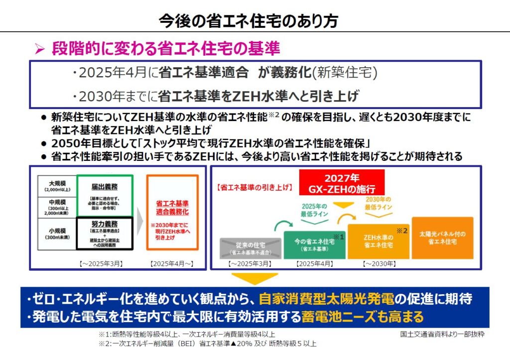 住宅分野では、2025年から省エネ基準適合が義務化され、2027年にはGX-ZEHが本格施行される見通し。2030年までに新築戸建住宅の6割に太陽光発電を設置する政府目標もあり、蓄電池は「選択肢」から「前提条件」へと変わる。