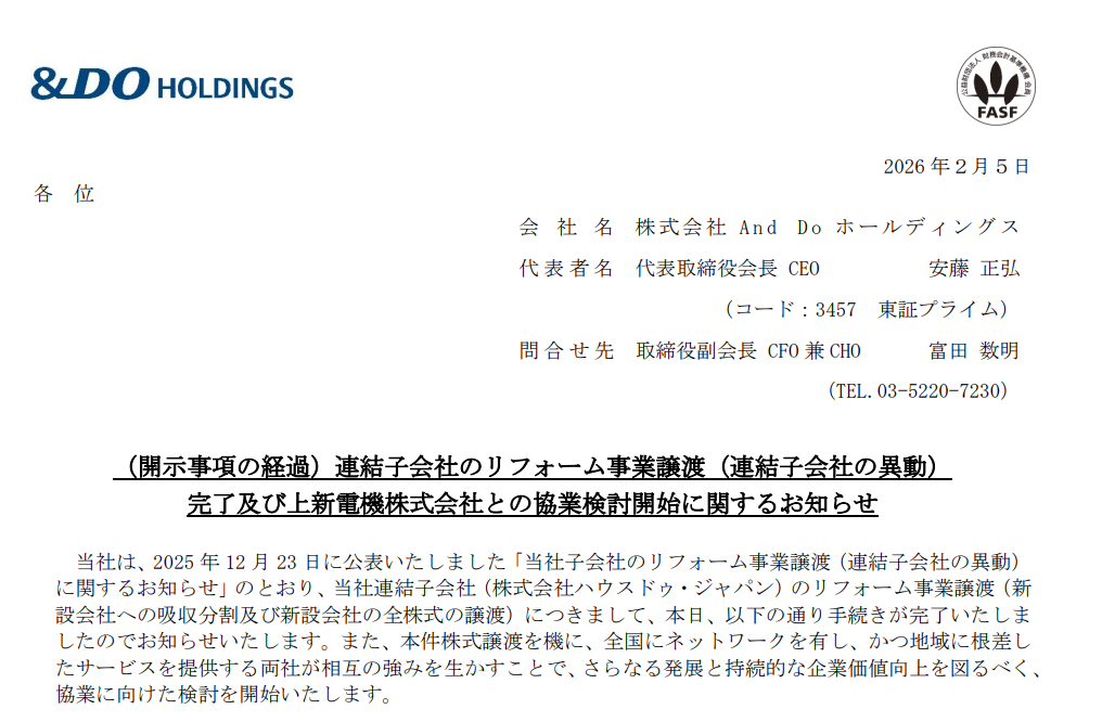 And Doホールディングスは5日、連結子会社ハウスドゥ・ジャパンのリフォーム事業の譲渡手続きが完了したと発表した。新設会社への吸収分割後、同社株式の全てを譲渡する方式で、実行日は2月5日。これに伴い2026年6月期第3四半期に事業譲渡益を特別利益として計上する見込みである。影響は既公表の通期連結業績予想に織り込まれており、現時点で数値の修正はないとしている。