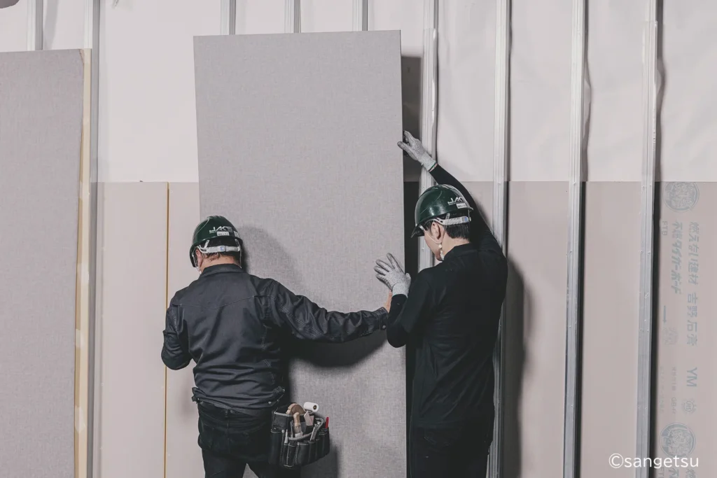サンゲツは2月12日、壁紙と石膏ボードを一体化した新建材「INNO PANEL」を発売する。従来の下地補修や現場での壁紙貼りを不要にし、100㎡あたり約180分の工程短縮を見込む。吉野石膏、フジプレアムとの3社連携で開発し、磁石と専用テープを用いる「スマートJG工法」を参考取付工法に採用した。ビス打ちが不要となり、粉塵や作業音の低減にもつなげる。