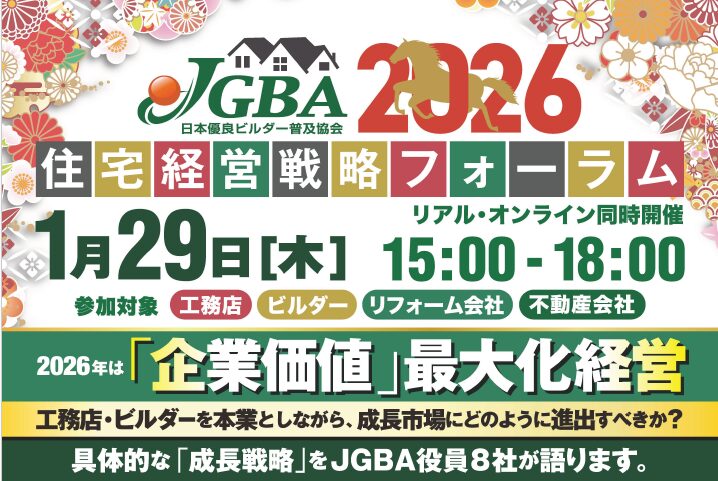 工務店・ビルダーを本業としながら、成長市場へどう進出すべきかを議論するセミナー「2026年は企業価値最大化経営」が1月29日、東京・赤坂でリアルとオンラインの同時開催で開かれ140名を越える聴衆が集まった。主催は(一社)日本優良ビルダー普及協会(JGBA)。住宅市場が縮小局面に入る中、木造の再定義、非住宅・土木参入、海外展開、M&Aなどをテーマに、全国の実践企業が具体策を示した。以下、基調講演から第三部までにアツく議論されたフォーラムの内容を詳報する。
