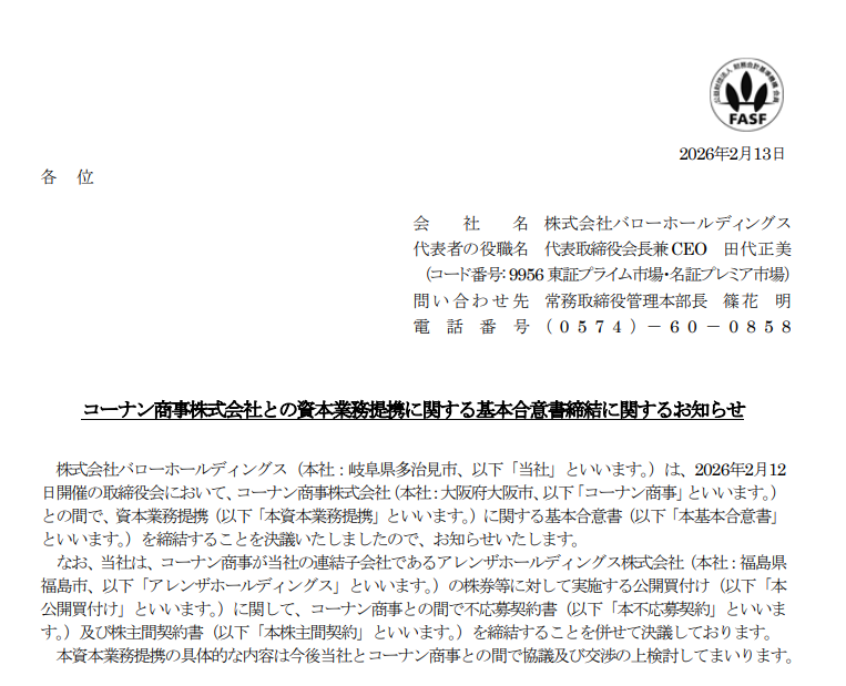 バローホールディングスは2月12日、ホームセンター大手コーナン商事との資本業務提携に関する基本合意書を締結することを決議した。コーナン商事がバロー子会社アレンザホールディングス株式に対して実施する公開買付けを契機に、3社の成長戦略を加速させる狙い。バローは公開買付けに応募しない不応募契約や株主間契約も締結し、長期的な協働体制を構築する。