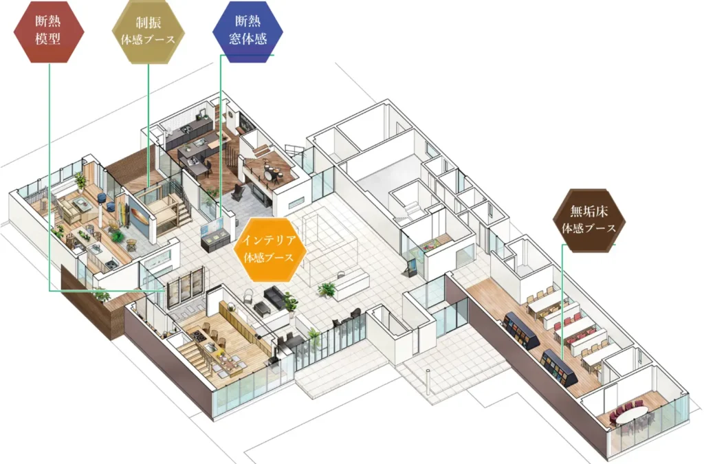 施設内には断熱性能の異なる窓を比較体験できる展示や、地震の揺れを再現する制振体験装置、構造・断熱模型などを設置し、住宅の基本性能を五感で理解できる構成とした。無垢材の床材比較や、カントリー・モダン・ジャパニーズの3スタイルのモデルルームも併設し、暮らし方に応じた空間提案を行う。性能重視とデザイン性を両立した住まいづくりを訴求し、体験を通じた顧客理解の深化を図る拠点として活用する。