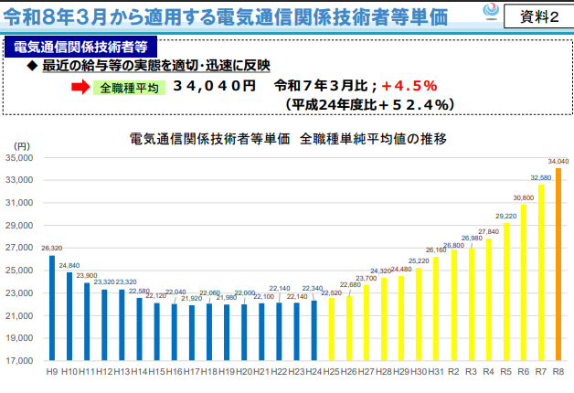 【調査】国土交通省:電気通信技術者単価を4.5%引き上げ、平均3万4040円に改定
