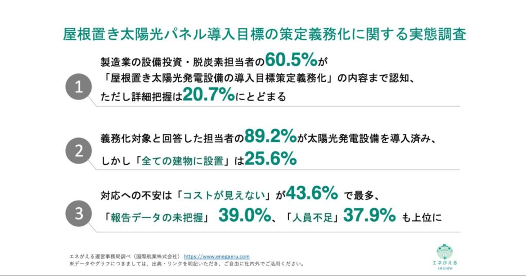 [独自レポートVol.39]2026年度開始の「屋根置き太陽光設置目標策定義務化」、対象企業の4割が「コスト不透明に不安」と回答 〜コスト可視化とリソース確保が制度対応の鍵に〜
