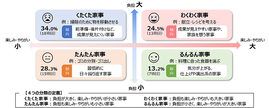 パナソニック ホームズは、既婚男女を対象にした「住まいの暮らしやすさに関する調査2025」を実施し、家事53項目を「負担」と「楽しみ・やりがい」の2軸で分析した。家事を「くたくた」「わくわく」「たんたん」「るんるん」の4分類に整理し、家事の心理的評価を可視化した。最も多かったのは負担が大きく楽しさが小さい「くたくた家事」で34.0%を占めた一方、負担が大きくても達成感を伴う「わくわく家事」も24.5%存在し、家事の評価が単純な負担感だけでは測れない実態が浮かび上がった。