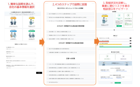 利用者は「知る」「減らす」「測る」「備える」の4項目に関する設問に回答することで、自社のカーボンニュートラルへの対応状況や気候変動に伴う事業リスクを確認できる。診断結果を基に、省エネルギーセンターが提供する省エネセルフ診断ツールや、中小機構の専門家による相談窓口などへの案内も行う。脱炭素に向けた行動を促す入り口として位置付け、中小企業の具体的な取り組み拡大につなげる。