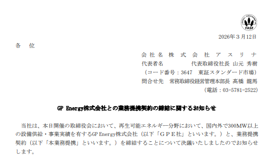 提携では、日本市場における蓄電池システム事業の開拓や事業スキームの検討に加え、蓄電池やPCS、キュービクル、EMSなどを含むシステム供給、技術支援、新たな事業モデルの共同検討まで幅広く進める。アスリナは国内複数サイトでの蓄電池案件推進を視野に入れており、GP Energyの供給力と技術知見を取り込むことで、事業の実効性と展開速度の向上を図る。