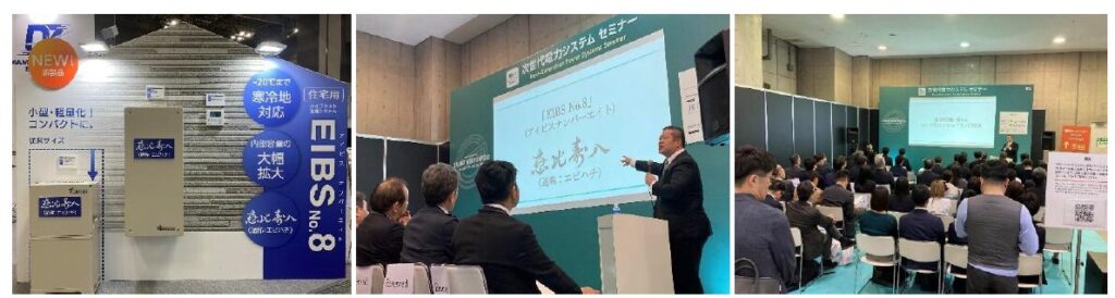 今回前面に押し出した「恵比寿八」は、同社が長年展開してきた蓄電システムの新機種にあたる。小野社長は、従来シリーズを知る顧客や販売現場への感謝を示しつつ「足掛け7年、お待たせしました」と述べ、新製品投入の意義を強調した。家庭の電力利用を拡張し、停電時や非常時への備えにもつながる製品として訴求したほか、寒冷地での屋外設置に対応する点や、小型化と高出力化を図った点にも触れた。