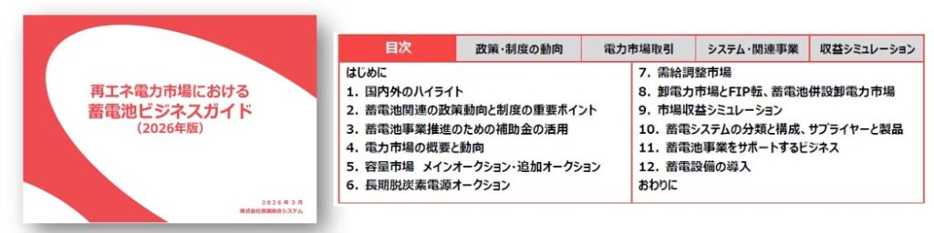資源総合システムは3月25日、「再エネ電力市場における蓄電池ビジネスガイド(2026年版)」を発行した。第7次エネルギー基本計画で蓄電池導入促進が打ち出される中、系統用や再エネ併設蓄電池を巡る政策、制度、電力市場の変化を踏まえ、事業環境の全体像を整理した。
