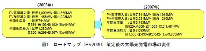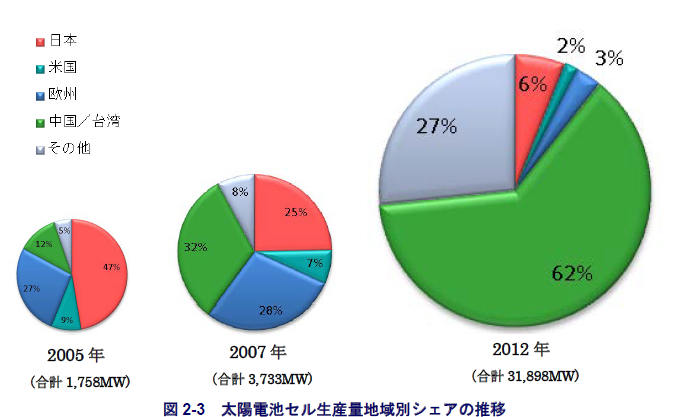 その後「太陽光発電を2030年までに主要なエネルギーの1つに発展させること」を目標に「太陽光発電ロードマップ(PV2030)」が2004年に技術開発指針として掲げられた。この間、我が国の住宅向けシステムへの導入補助が世界の太陽光発電産業と市場を牽引したが、2000年代後半に入り状況は急変する。欧州各国が固定価格買取制度(FIT)を導入し、太陽光市場は日本から欧州へと中心を移した。同時に中国メーカーが台頭、日本シェアは急低下する。