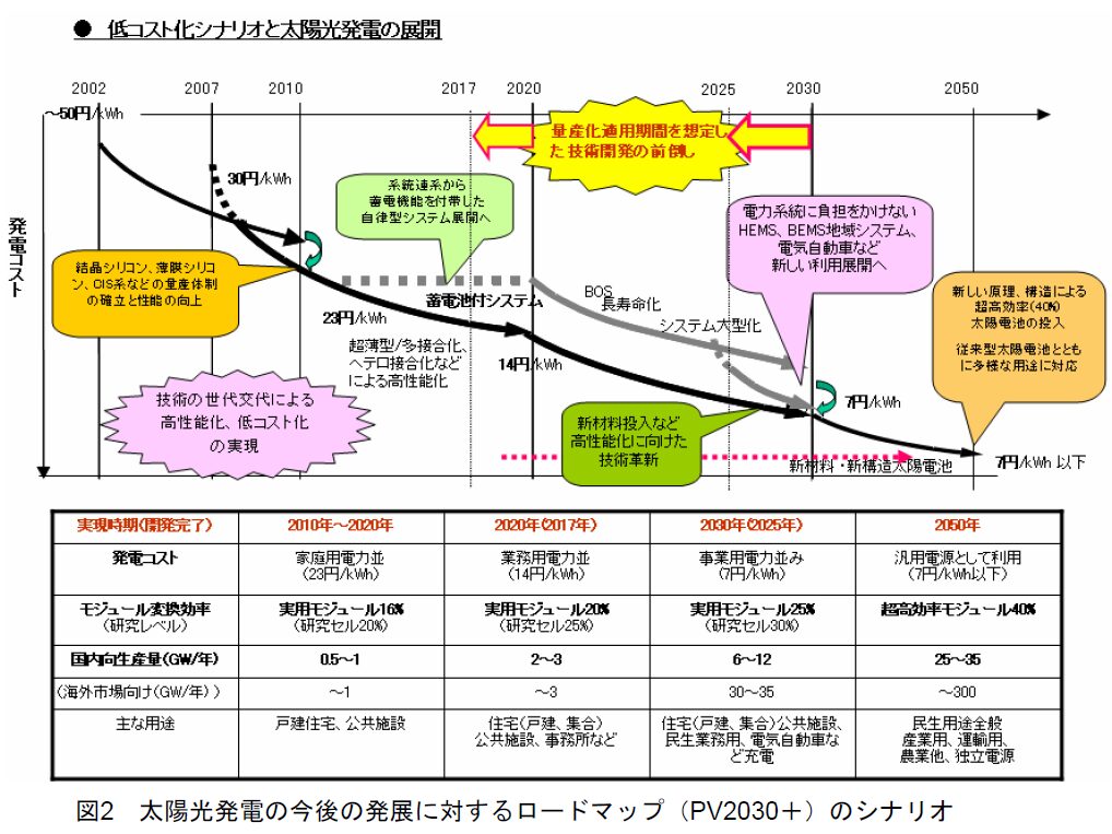 この危機感を背景にNEDOは2004年の『PV2030』を大幅に見直し、2050年を見据えた長期戦略「太陽光発電ロードマップ(PV2030+)」をまとめた。太陽光市場は日本主導からグローバル競争時代へ移行。「2050年に国内一次エネルギー需要の5〜10%を太陽光で賄うとともに、世界需要の約1/3を供給可能な産業力の確立」を目指す方針を掲げた。