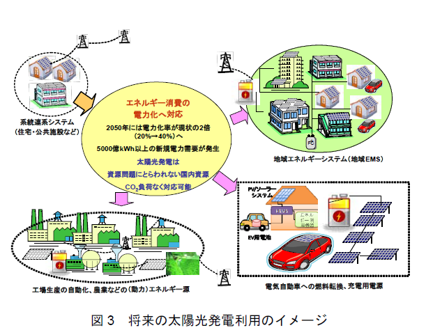 戦略の中心は、引き続きコスト低減とGrid Parityの早期実現であり、モジュールやシステムの高効率化、製造プロセスの低コスト化、長寿命化を重視。発電コストは2030年までに7円/kWh程度とし、2050年までにさらに低減をロードマップに据えた。システム全体の最適化として、蓄電池との連携、系統制御技術、需給予測・制御技術を確立し、電力システム全体の効率向上も議論されはじめた。
