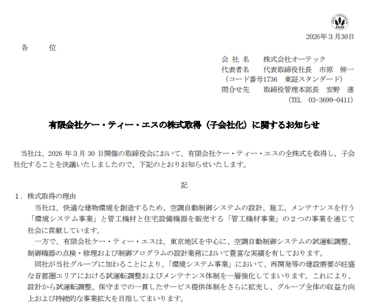 ケー・ティー・エスは東京地区を中心に実績を持ち、直近2025年5月期の売上高は約1億9000万円、営業利益は約1400万円だった。オーテックは設計、施工、保守に加え、試運転調整やメンテナンスまでの一貫サービスを強化し、収益力向上と持続的な事業拡大につなげる考え。業績への影響は軽微としているが、空調自動制御分野の技術・人員を取り込むことで、都市部の建物環境需要への対応力を高める動きとなる。