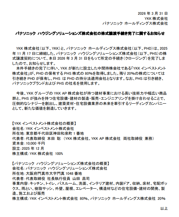 YKKとパナソニック ホールディングスは、パナソニック ハウジングソリューションズの株式譲渡手続きを2026年3月31日付で完了した。YKKが新設した中間持株会社のYKKインベストメントが株式80%を取得し、残る20%はパナソニックHDが保有する形となる。