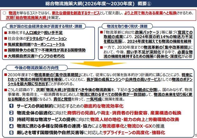 大綱は、供給制約への対応、物流全体の最適化、物流人材の地位向上と労働環境改善、標準化とDX・GX推進、国際情勢や災害に備えた強靱化の5本柱で構成する。2024年問題後の輸送力不足が懸念されるなか、荷主や消費者の行動変容も含めた構造改革を促す内容。物流を成長エンジンかつ公共性の高いサービスとして再構築する政策指針となる。