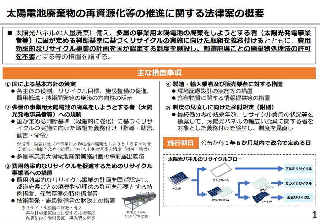 柱の一つは、多量の事業用太陽電池を廃棄しようとする発電事業者などへの規制強化だ。国が定める判断基準に沿って、リサイクルの実施に向けた取組を求めるほか、多量廃棄時には処分方法や排出時期、委託先などを記した実施計画の事前届出を義務付ける。届出受理後、原則30日を経なければ廃棄に着手できず、内容が著しく不十分な場合は計画変更の勧告や命令も可能とする。あわせて、費用効率的なリサイクル事業計画を国が認定し、認定事業者には都道府県ごとの廃棄物処理法上の許可を不要とする特例を設ける。広域的な収集運搬や保管、処理を進めやすくし、コスト低減と処理能力の拡大を後押しする狙いがある。さらに、製造・輸入業者や販売業者には、長寿命化や軽量化、易解体設計といった環境配慮設計、含有物質情報の提供などを促す。施行は公布から1年6カ月以内。今後はリサイクル費用や最終処分場の状況を見ながら、より幅広い関係者への義務付けも検討対象となる。