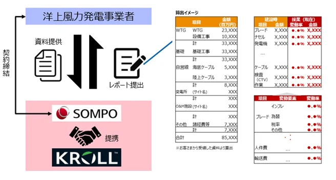 損保ジャパンとSOMPOリスクは、洋上風力発電所向けに保険価額再評価サービスと地震リスクの定量評価サービスを4月に始めた。世界的なインフレ進行で、タービンや海底ケーブル、変電所などの再建・再調達費が建設時から乖離している可能性を踏まえ、保険金額や最大予想損害額の見直し需要に対応する。主要設備の本体価格に加え、再設置に伴う材料費や人件費、諸経費まで織り込んで算出する。