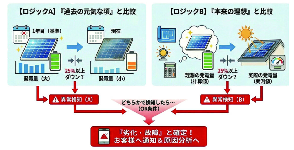 ミサワホーム総合研究所は、住宅用太陽光パネルの劣化や故障の兆候を24時間365日で自動検知する新サービスを開発した。天候や季節による発電量の変動に左右されにくい診断ロジックを導入し、設置初年度の正常データとの比較と、建物情報から算出する理論発電量との比較という2つの手法を組み合わせる。生活者が気づきにくい発電低下や異常の早期発見につなげる。