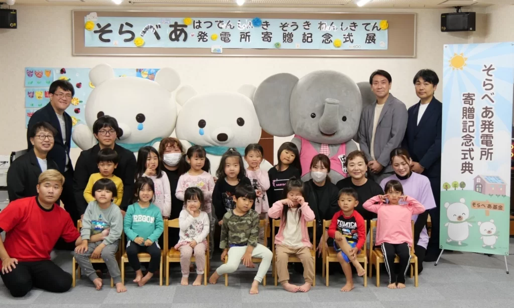 ゆめソーラーを展開するリフェコは、そらべあ基金の「ご当地版 そらべあスマイルプロジェクト」に協賛し、熊本県合志市の「ゆうすい保育園とよおか」に太陽光発電設備を寄贈した。4月10日には寄贈式と環境ワークショップを開催し、園児が地球温暖化や再生可能エネルギーについて学ぶ機会を設けた。寄贈設備は5.58kWで、年間約2818キログラムのCO2削減を見込む。