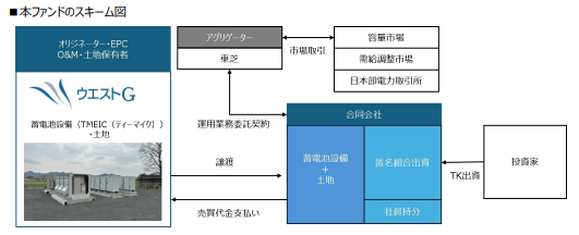 ファンドはGK-TKスキームを活用し、ウエストグループが開発、建設、保守を担う。蓄電所システムにはTMEIC製を採用し、運用は東芝がアグリゲーターを務める。電力需給の安定化や再エネ変動対策を後押しし、蓄電所の資産化を通じて市場拡大を図る動きとして注目される。