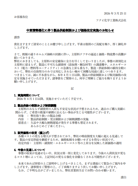 フクビ化学工業は、中東情勢悪化に伴い、2026年4月1日以降、製品供給制限と販売価格改定を実施する。ホルムズ海峡封鎖を受けた主原料ナフサの逼迫に加え、副資材の調達難やエネルギーコストの急上昇が重なり、製造・供給体制の維持が難しくなっているためだ。対象は同社取り扱い製品全般となる。