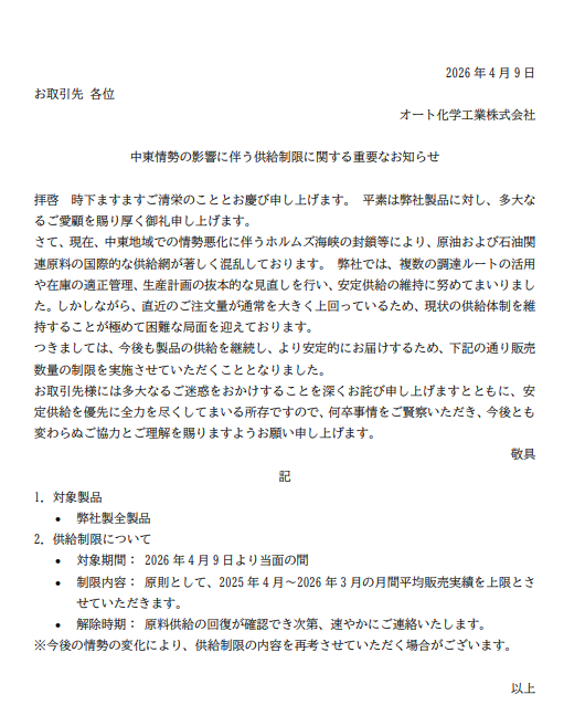 オート化学工業は、中東情勢の悪化に伴う原油・石油関連原料の供給網混乱を受け、全製品の供給制限を2026年4月9日から当面実施する。ホルムズ海峡封鎖などの影響で調達環境が悪化するなか、直近の受注量が通常を大きく上回り、現行の供給体制維持が難しくなったことが理由だ。