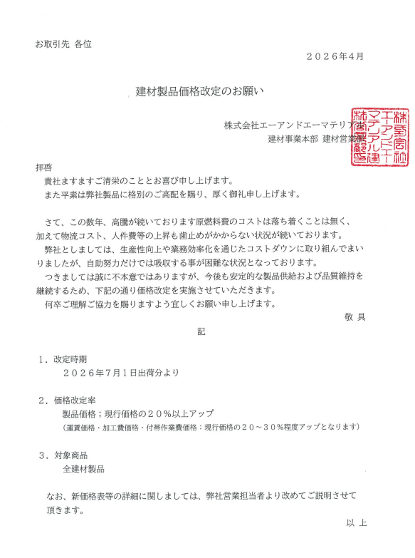 同社は生産性向上や業務効率化によるコストダウンに取り組んできたが、自助努力だけでは吸収が難しい水準に達したと説明する。今後も安定的な製品供給と品質維持を続けるため、価格改定は避けられないと判断した。詳細な新価格表は営業担当から別途案内するとしており、建材分野でのコスト転嫁の流れが夏場に向けてさらに広がる可能性がある。