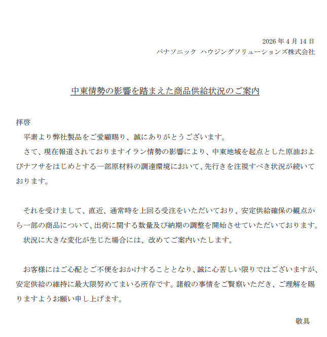 パナソニック ハウジングソリューションズは、中東情勢の影響を踏まえた商品供給状況を公表し、一部商品で出荷に関する数量および納期の調整を始めたと明らかにした。イラン情勢を背景に、中東地域を起点とする原油やナフサなど一部原材料の調達環境で先行き不透明感が続いている。こうした状況を受け、通常時を上回る受注が直近で発生しているという。