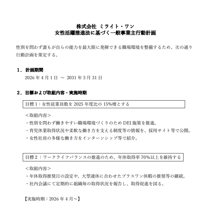 ミライト・ワンは、女性活躍推進法に基づく一般事業主行動計画を策定した。計画期間は2026年4月1日から2031年3月31日までの5年間で、女性従業員数を2025年度比で15%増やすことと、年次有給休暇取得率70%以上を維持することを目標に掲げた。女性活躍の状況把握と課題分析を踏まえ、就業環境の整備を進める。