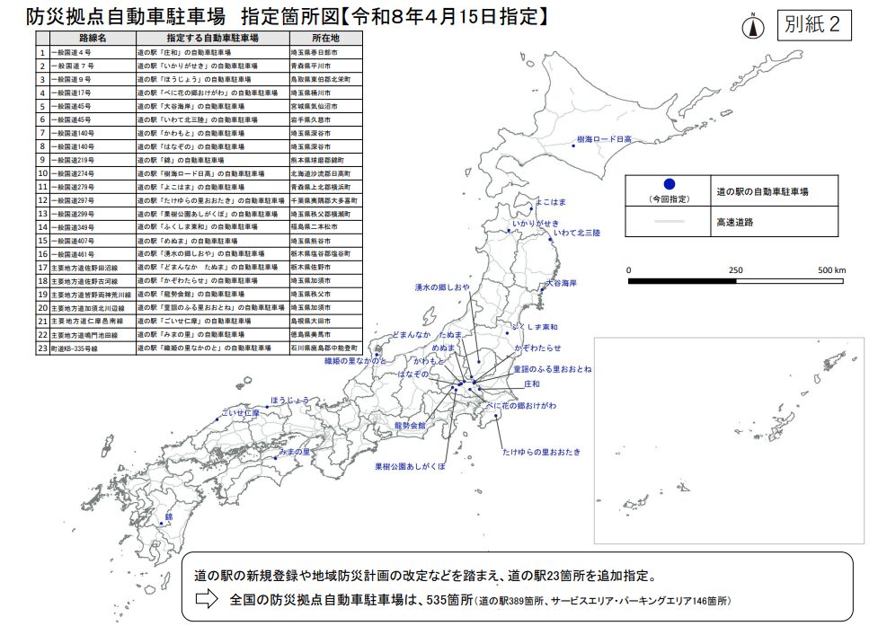 【防災・防犯・事故等】国土交通省:防災拠点自動車駐車場を23カ所追加指定。全国535カ所に拡大、道の駅の災害対応力を強化