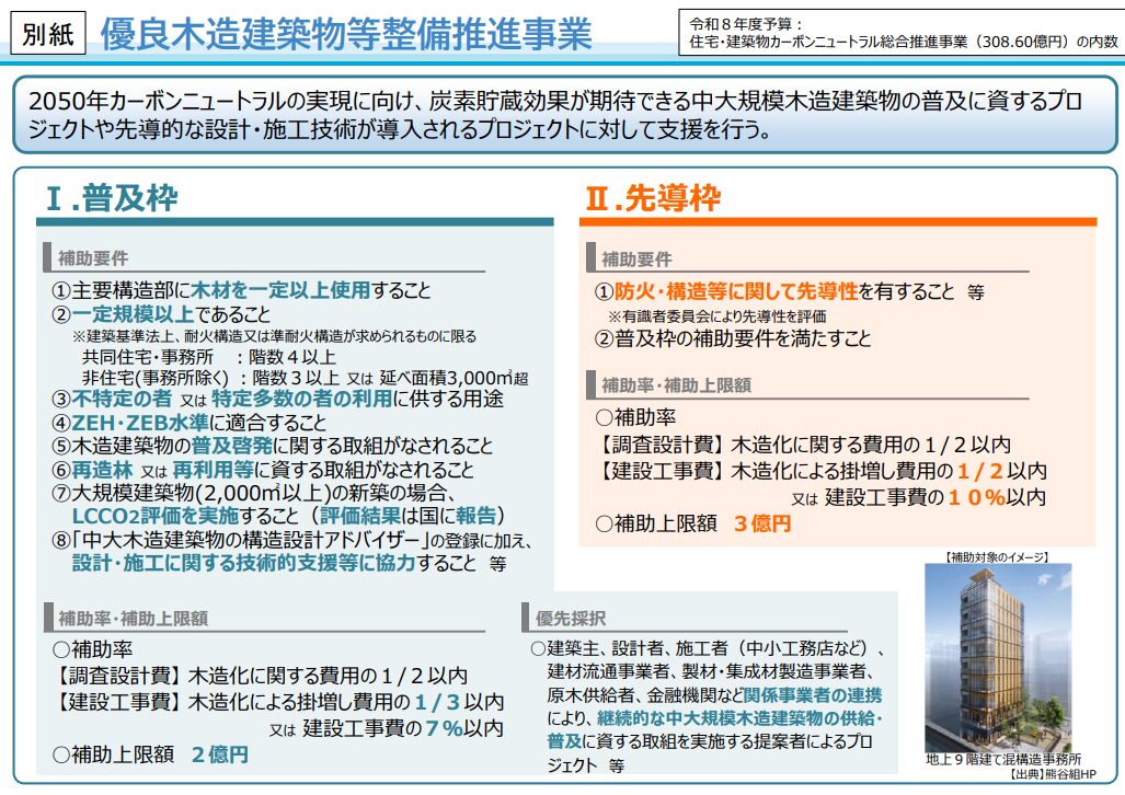 国土交通省は、2050年カーボンニュートラル実現に向け、中大規模木造建築物の普及と木造化技術の高度化を後押しする「令和8年度優良木造建築物等整備推進事業」の提案募集を始めた。対象は炭素貯蔵効果が期待できる中大規模木造建築物の普及に資する「普及枠」と、先導的な設計・施工技術を導入する「先導枠」。木材の一定量使用、一定規模以上、不特定多数が利用する用途、ZEH・ZEB水準適合などの要件を設ける。