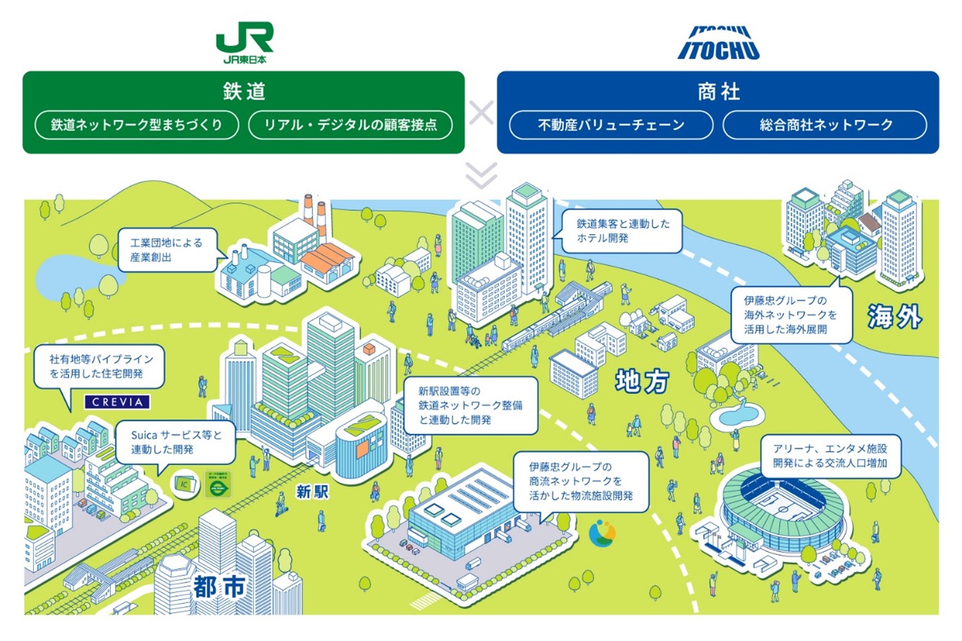 【提携・M&A・新会社】JR東日本・伊藤忠商事:不動産事業統合契約を締結。新会社で5年後売上2500億円規模めざす
